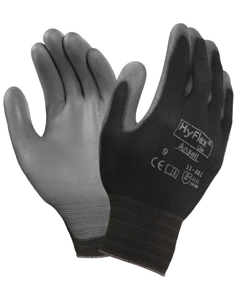 - 11-601 gray polyurethane palm coated, black nylon liner, and hides soil providing longer wear and reducing overall replacement costs