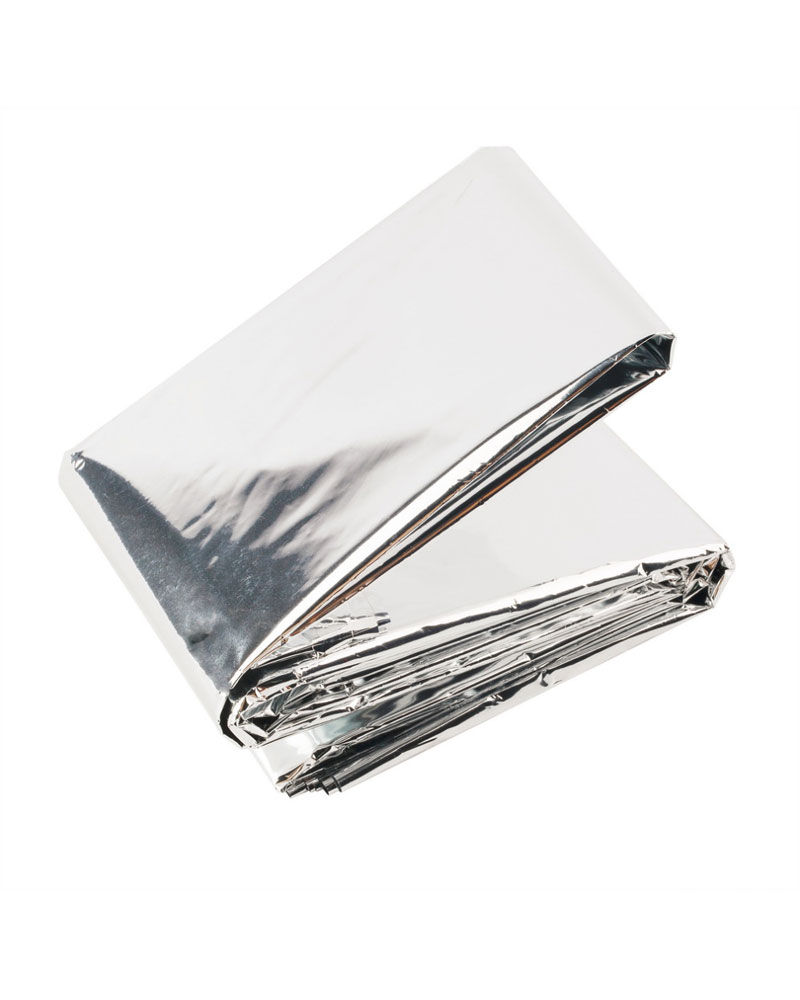 This foil rescue blanket assists in body heat retention in emergency situations.